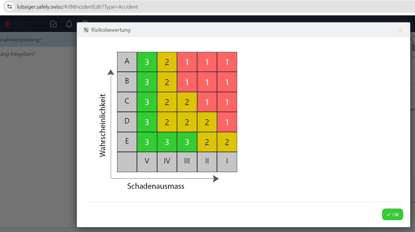 die 5 x 5 Risikomatrix in Safely ist hinterlegt, jedoch ist keine Legende/Beschriftung vorhanden, was die einzelnen Stufen bedeuten.